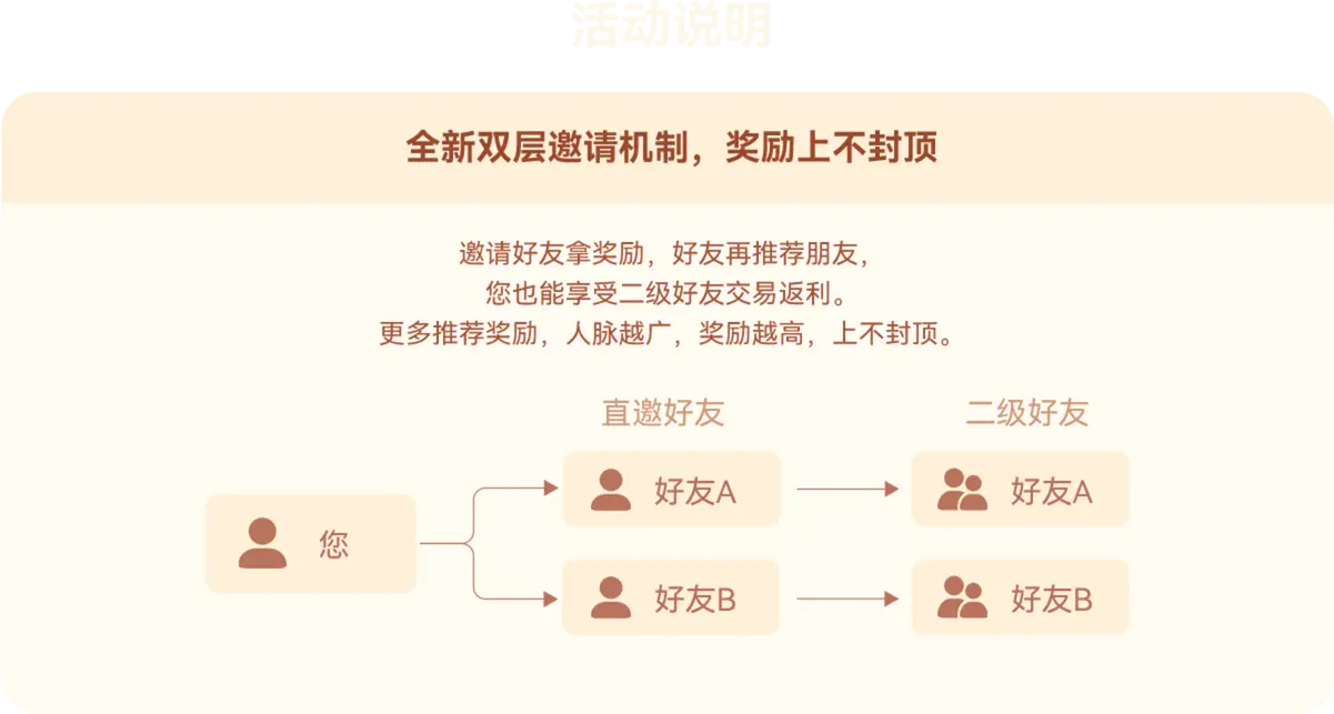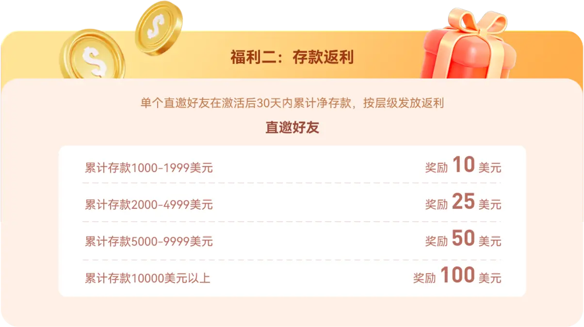 (3)存款奖励统计的是直接单个邀请好友在激活后30天内的累计存款,当存款达到对应层级,即可领取对应的存款奖励。按每周发放时最新存款金额数据发放。